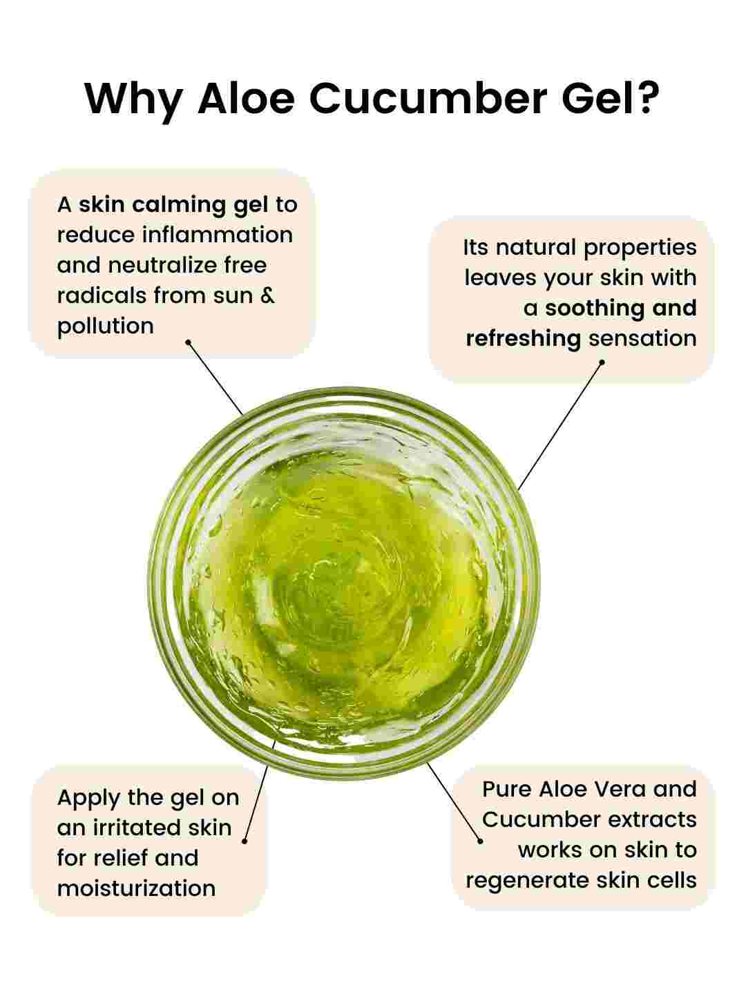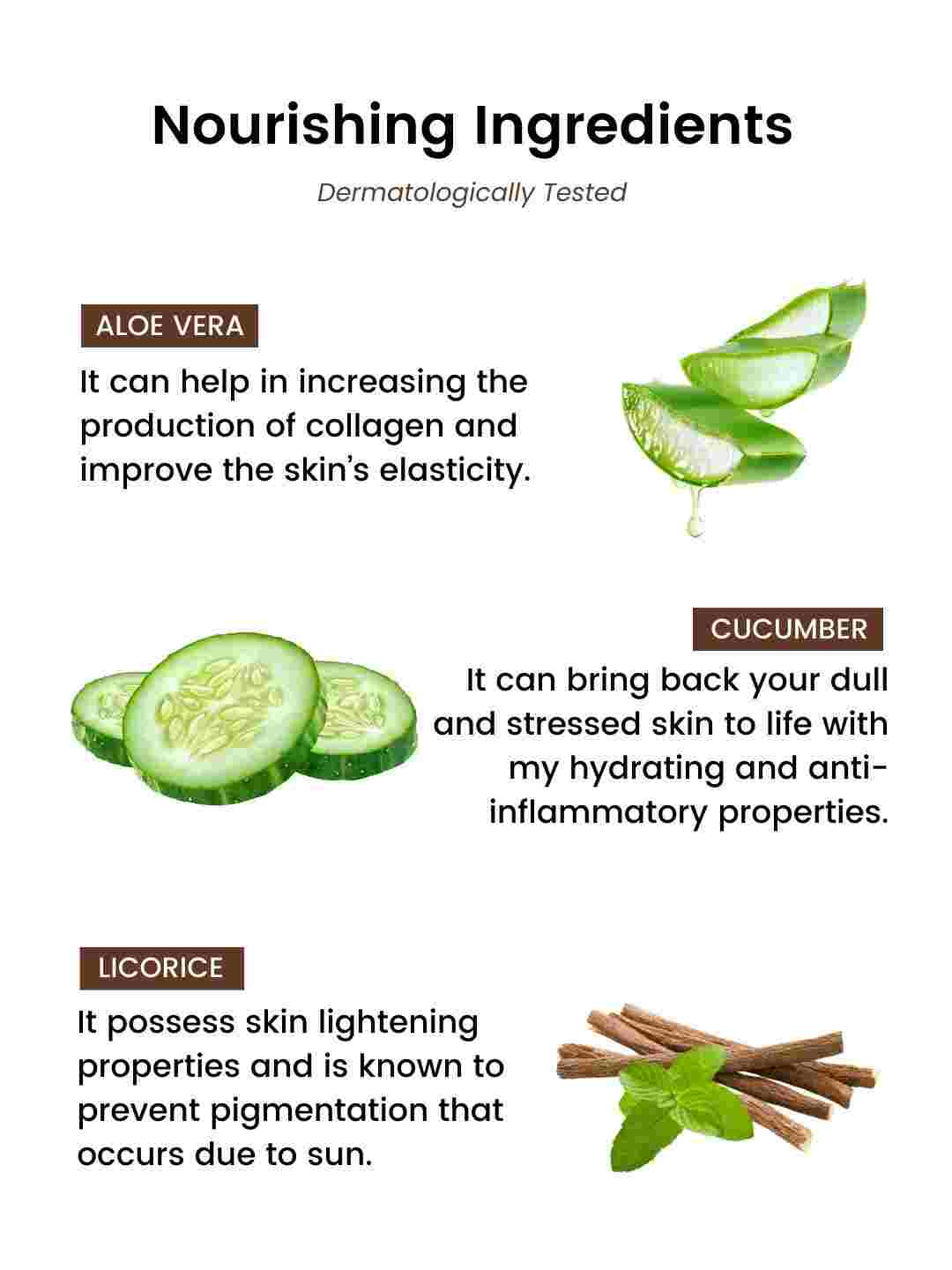 Cucumber helps provide the skin with inflammation-fighting Vitamin C and these nutrients give a rejuvenating effect to the skin. Its soothing, cooling effect on the skin will benefit if you have an irritated and sensitive skin. It can help reduce morning puffiness and give a refreshed look. It can bring back the dull and stressed skin to life with its hydrating and anti-inflammatory properties.