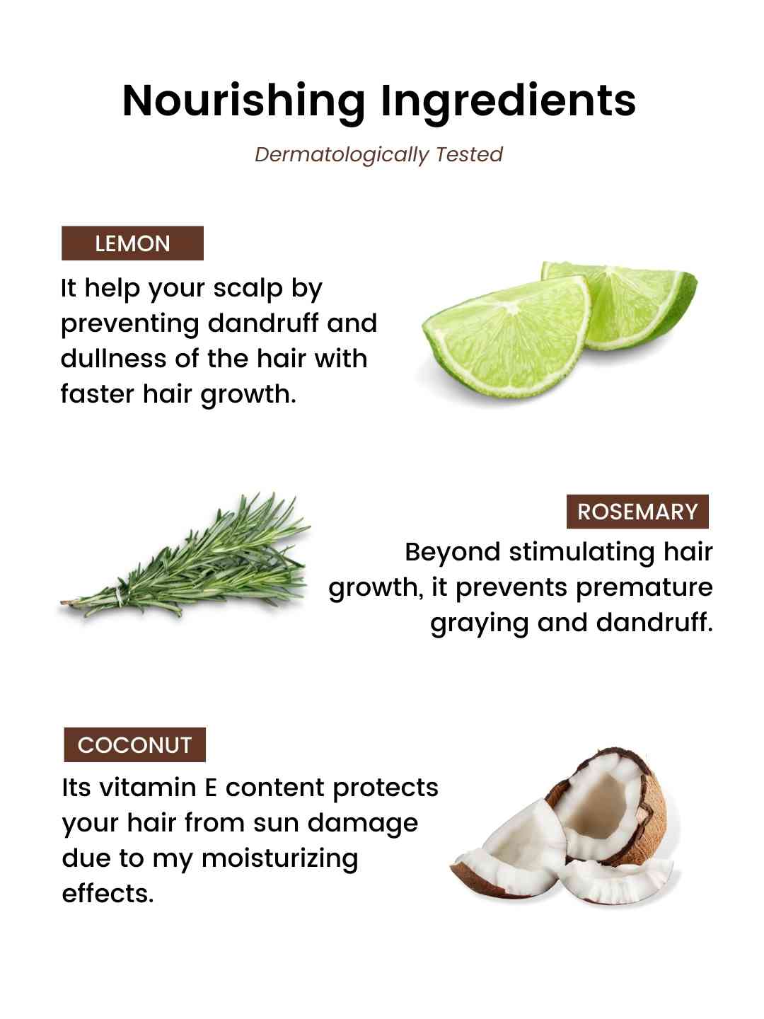 The active ingredients from neem, lemon, olive and rosemary helps the prevention of premature graying, dandruff and stimulates hair growth. While lemon helps in cleansing the scalp by preventing dandruff and dullness of hair.