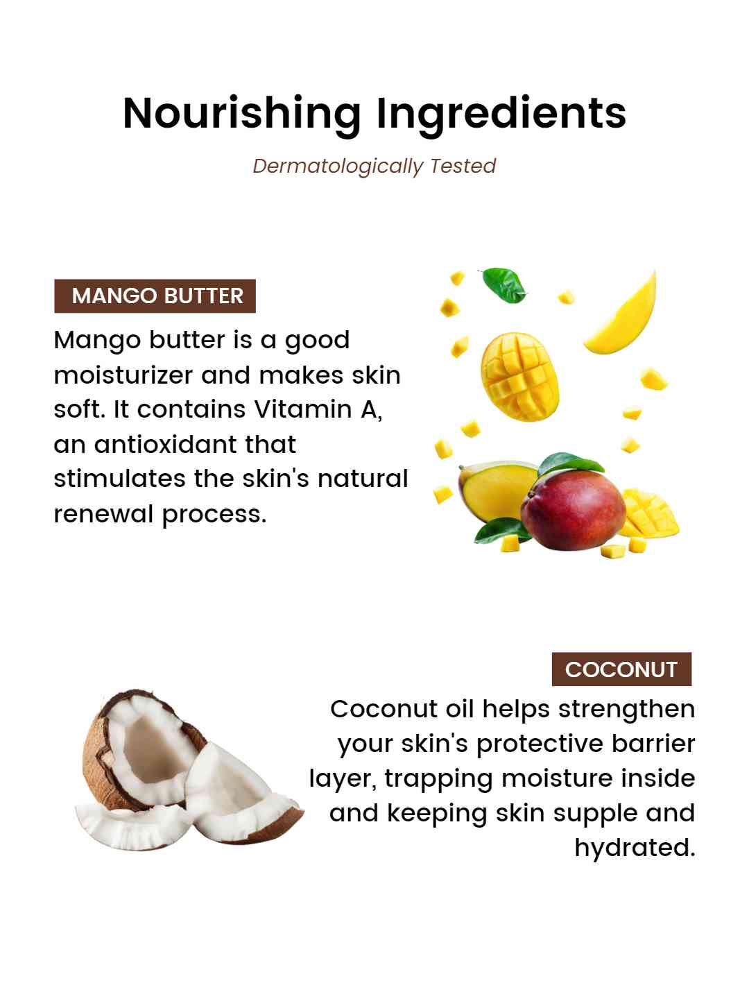 The rich cocoa butter nourishes and leaves you with an invigorating feeling. The active ingredient derived from cocos nucifera oil, commonly known as coconut oil is effective in healing burns, smoothen dry skin and is completely safe to use in personal care products. Coconut oil is widely accepted for its body care quality standards set by Whole foods.