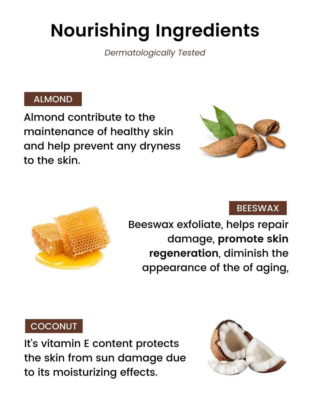 Beeswax along with Almond seed oil does wonders for your skin reversing any sun damage and removing the dead skin cells. Beeswax in the lotion will work double-duty to keep your skin soft and hydrated.