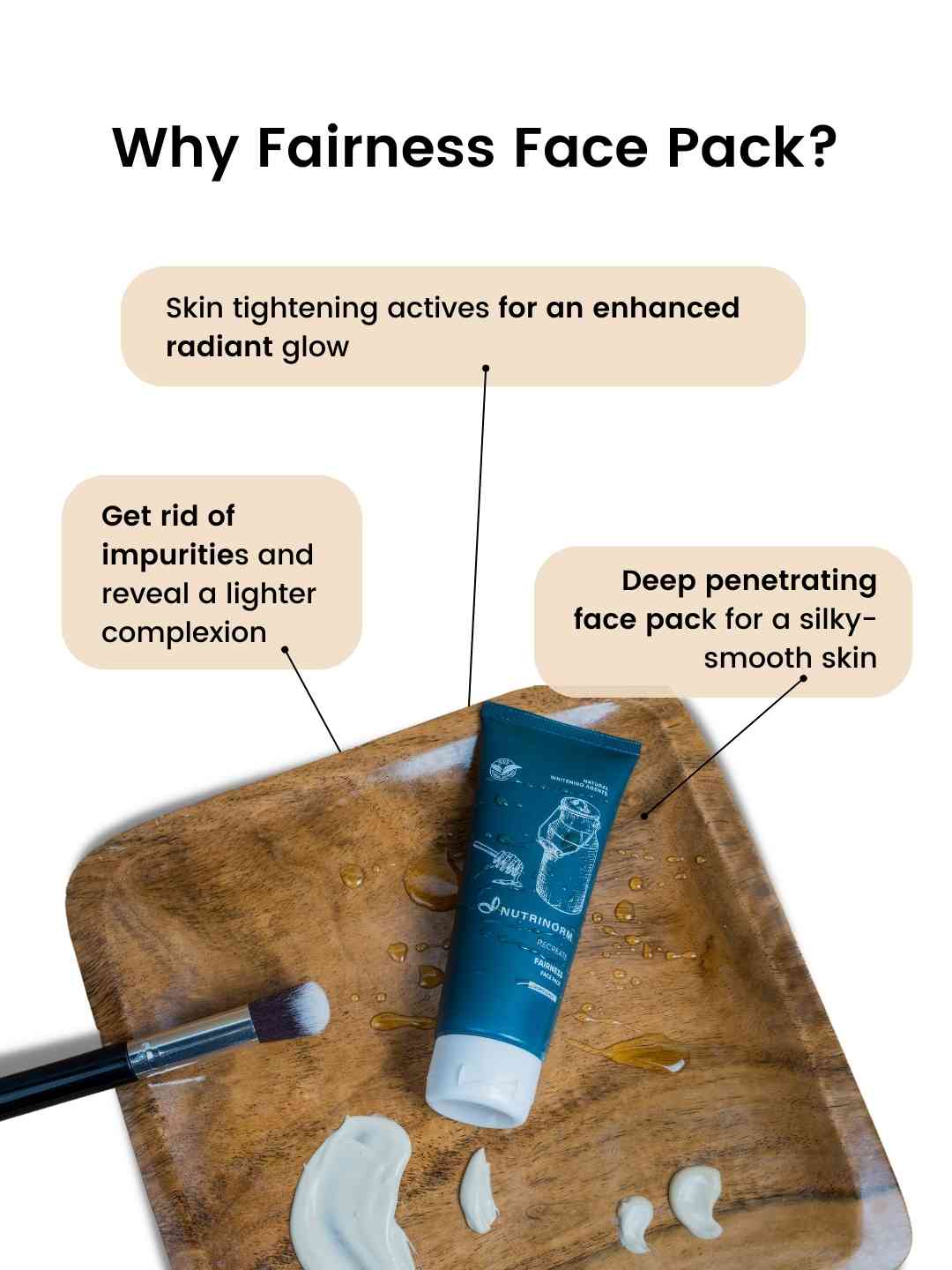 Nutrinorm Fairness Face Pack is enriched with lactic acid (from milk) which contain Alpha-hydroxy acid that naturally eats away dead skin cells. The active ingredients combined together gently exfoliates dead skin cells and blackheads.
