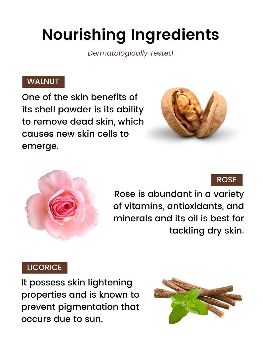 The Gentle Exfoliating Walnut Scrub is enriched with the goodness of Gulab, Licorice, Makaya and Apricot, which are dermatologically tested and it stimulates the skin cells and makes the skin smooth and radiant.