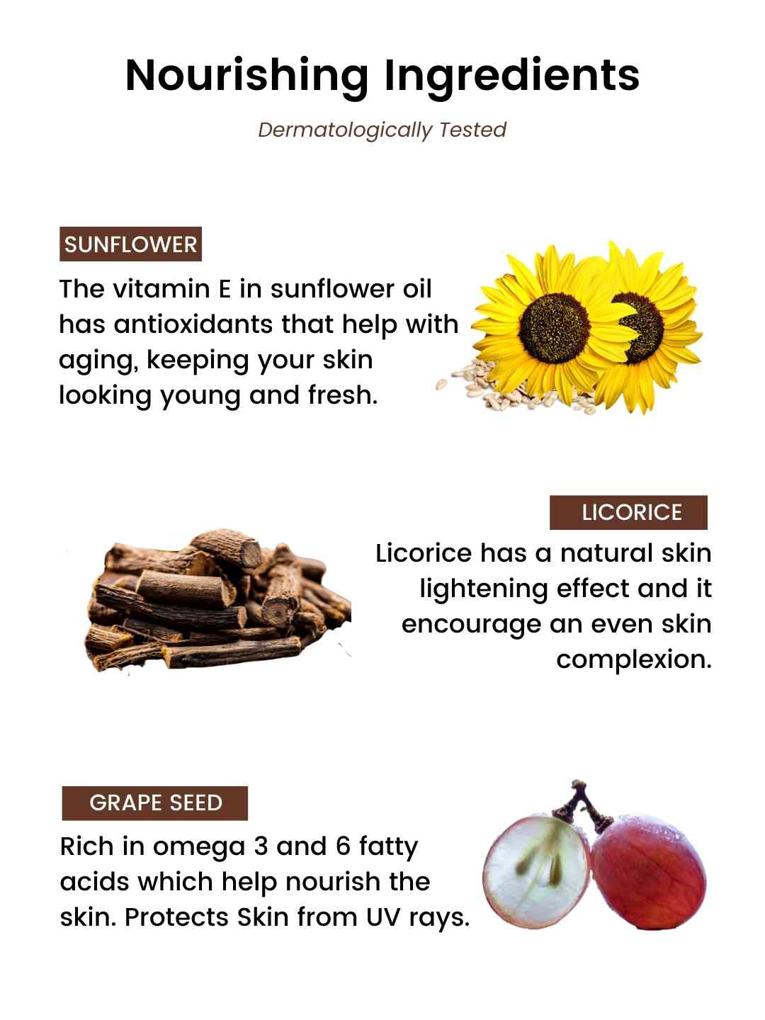 The hydrating body lotion contains high quality virgin coconut oil, pure olive oil, grape seed oil and Glycyrrhiza glabra which has a soothing effect; the formula absorbs quickly into the skin, so you're not left with a greasy feeling. Sunflower is rich in Vitamins A & E helping in promoting skin health. While the cocos nucifera oil is ideal for healing burns, soothing dry skin and definitely safe for use in cosmetics!