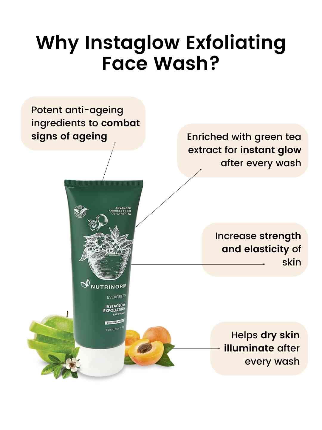 Instant glow after every wash. Is it even possible! Nutrinorm's Instaglow Exfoliating Face Wash is enriched with green tea, rosemary oil, maize, apricot, licorice and apple to reduce any dark spots and blemishes, fines lines and wrinkles making your skin smooth and soft.