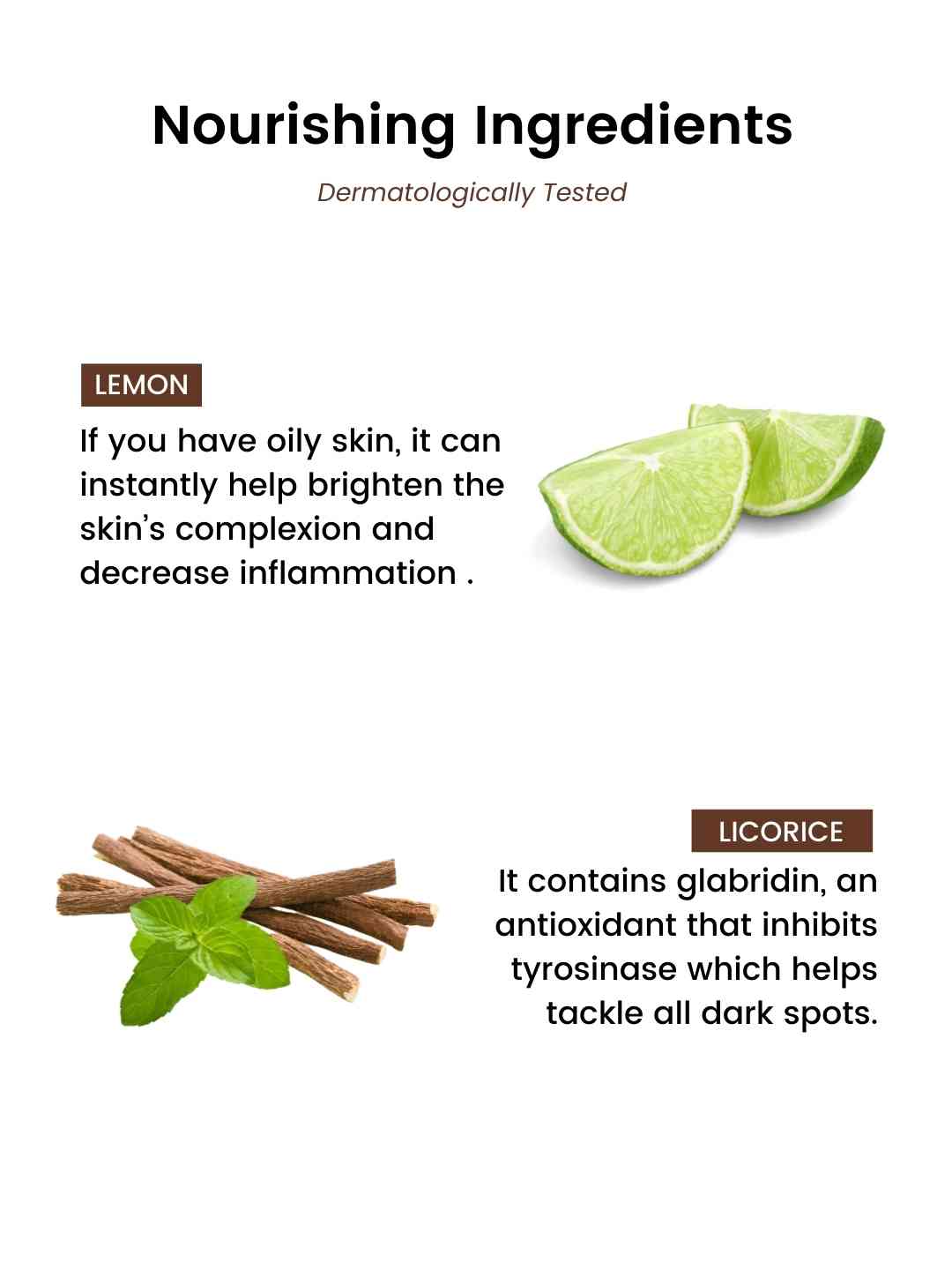 Licorice: It contains glabridin, an antioxidant that inhibits tyrosinase which helps tackle all dark spots.