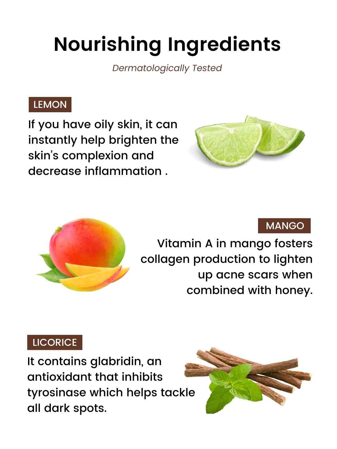 Enriched with mango, lemon and licorice, the combination of these ingredients help fight acne and pigmentation by removing excess oil from the face. The essential vitamins help enhance the skin condition by fostering the collagen production to lighten the acne scars.